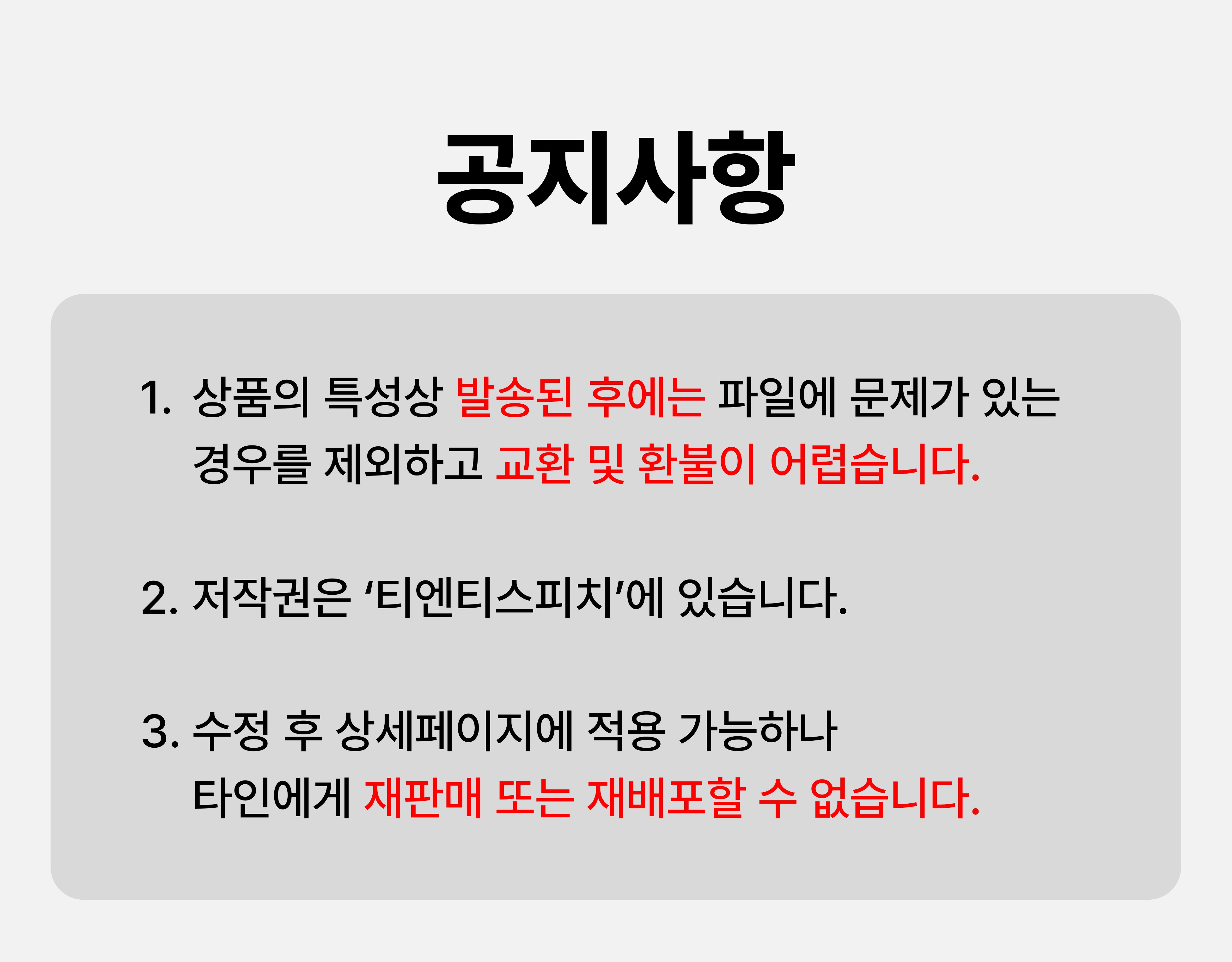 - 온라인 상품의 특성상 다운로드한 후에는 파일에 문제가 있는 경우를 제외하고 교환 및 환불이 어려운 점 참고 바랍니다.